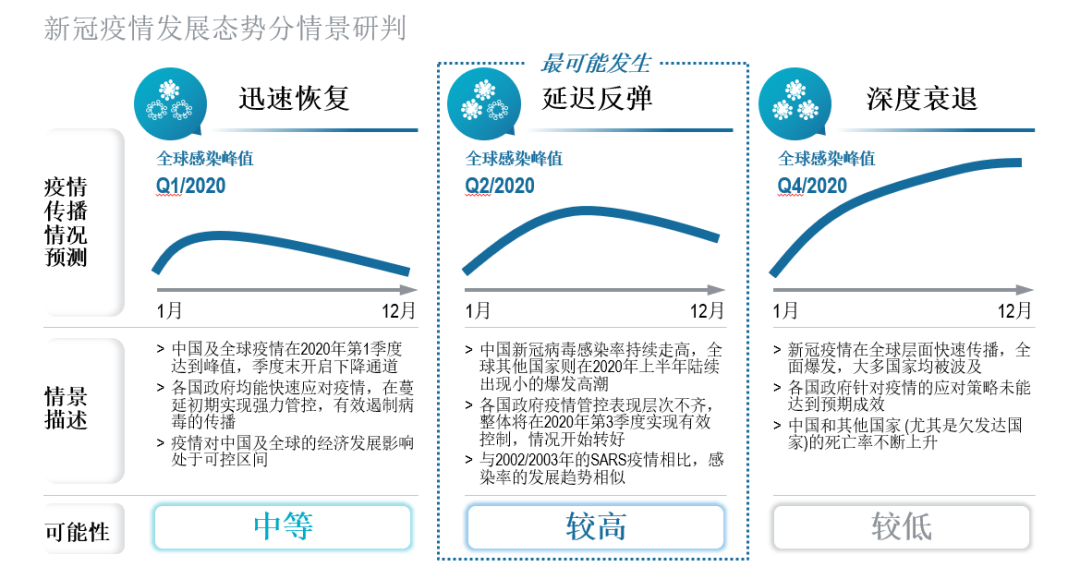 针对未来新冠疫情的发展态势,将存在“迅速恢复”、“延迟反弹”、“深度衰退”三种潜在情景,分别意味着全球感染峰值出现在今年第1季度、第2季度与第4季度。聚焦全球视角,“延迟反弹”情景发生的可能性相对较大,全球感染人数将在今年下半年逐渐回落。